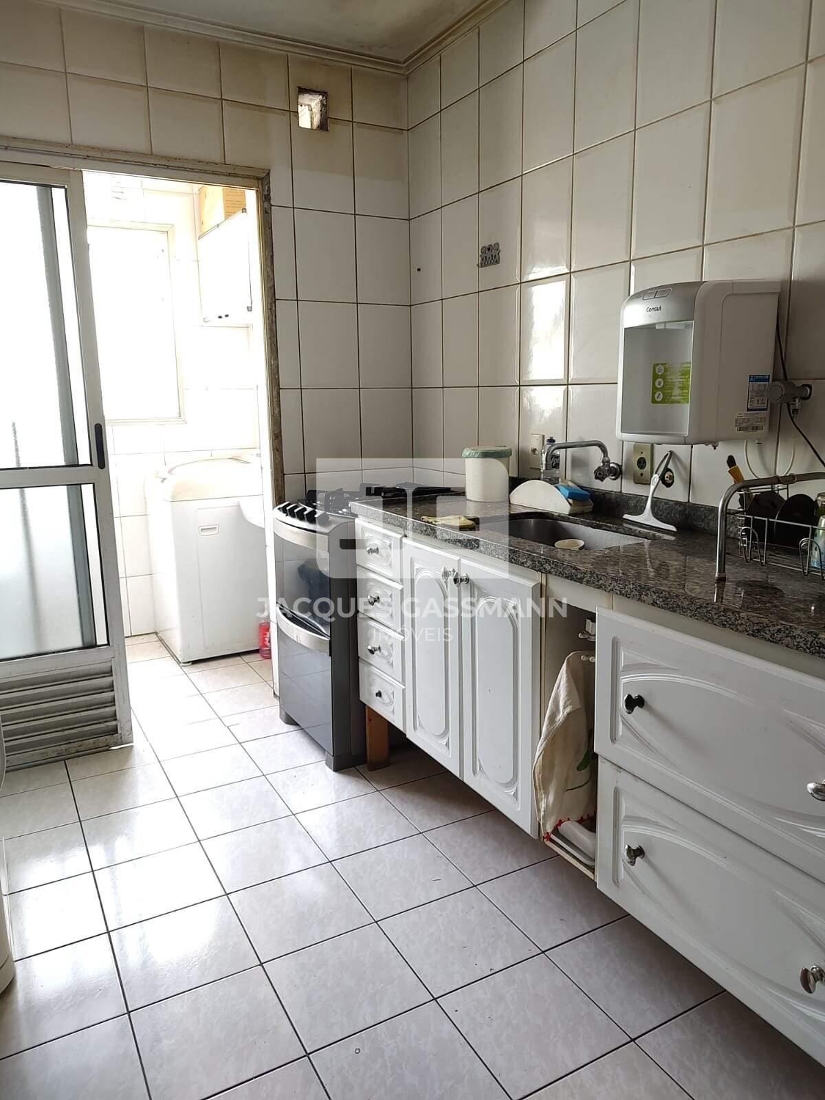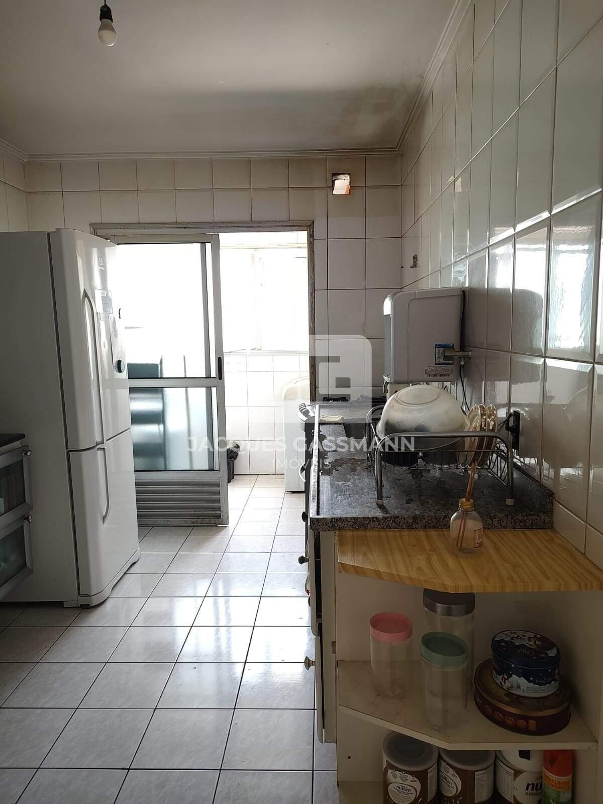 Possui uma cozinha equipada com armários planejados e uma área de serviço para lavanderia.