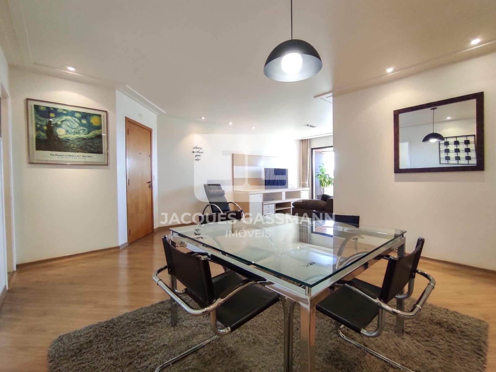 Sala de jantar com buffet projetado, que será entregue com mesa tampo de vidro e pés em aço inox, 4 cadeiras com braços, luminária da mesa e tapete.